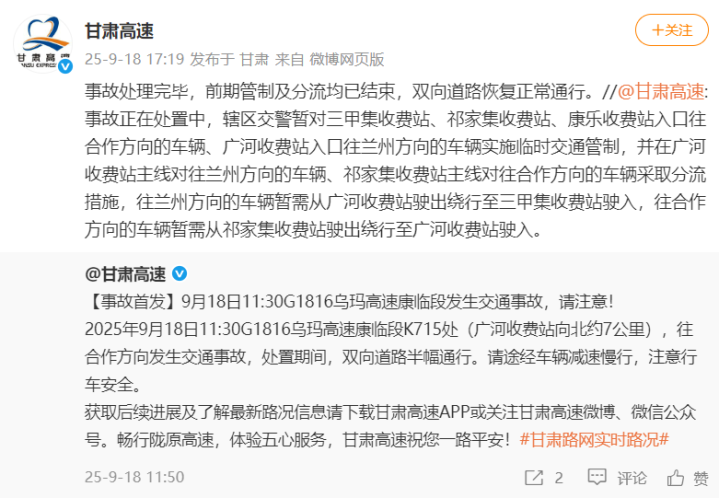 当晚,据@甘肃高速通报:事故处理完毕,前期管制及分流均已结束,双向道路恢复正常通行。